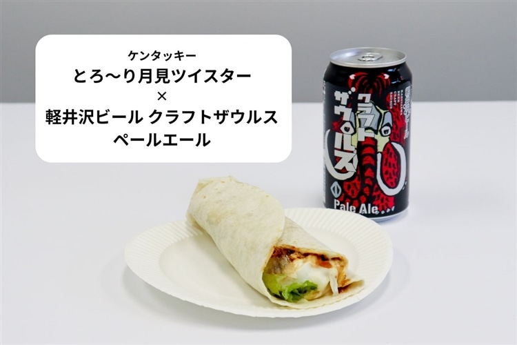 ケンタッキーのとろ~り月見ツイスターにマッチしたのは「軽井沢ビール クラフトザウルス ペールエール」! ツイスターの中にピリリと辛い爽やかなスパイスが隠されていて、これが突き抜けるような爽やかなホップの香りをもつクラフトザウルスの味わいを引き立たせてくれました。ソースやマヨ、チキンの旨味で食べ応えもばっちりな、一同絶賛の組み合わせでした。